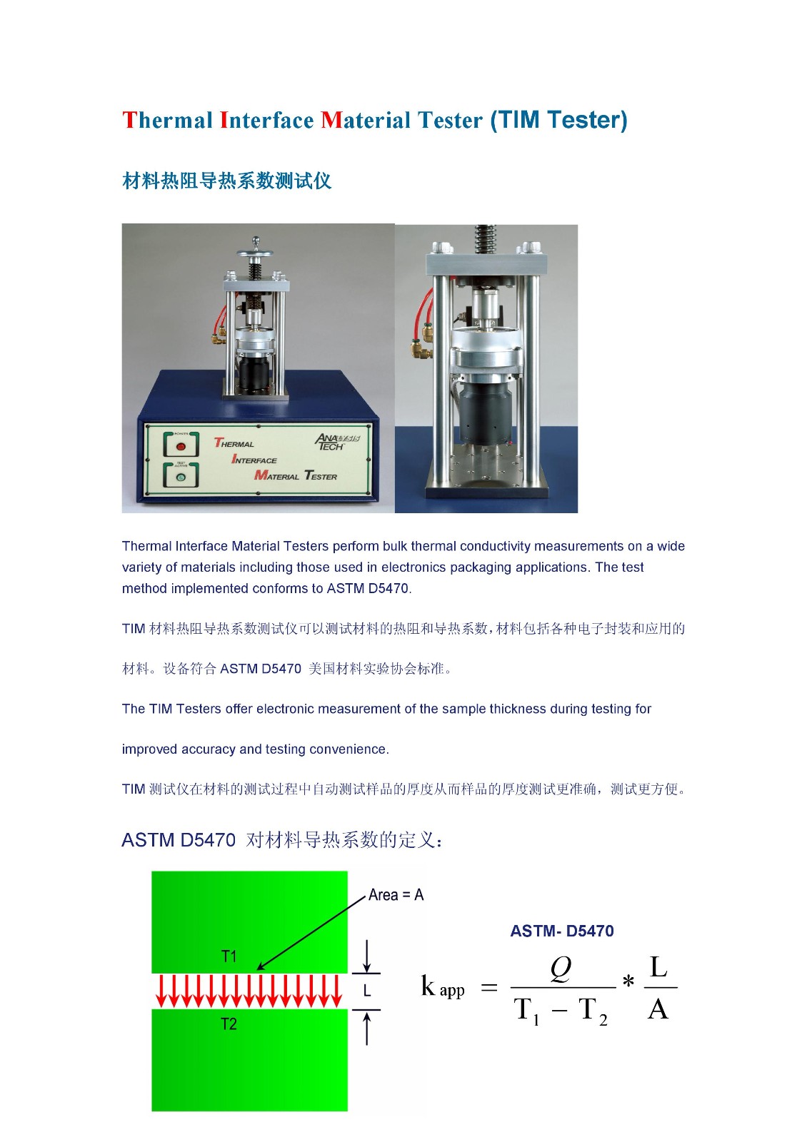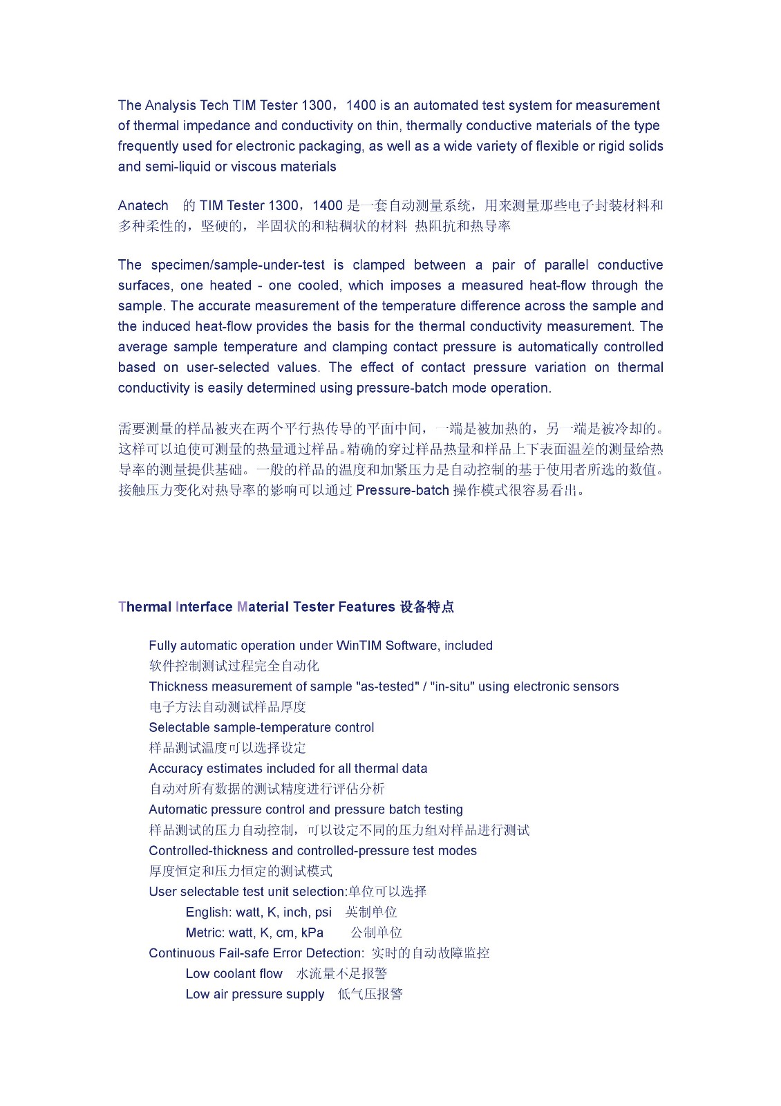 Anatech 的TIM Tester 1300,1400是一套自動測量系統(tǒng),用來測量那些電子封裝材料和多種柔性的,堅硬的,半固狀的和粘稠狀的材料熱阻抗和熱導率需要測量的樣品被夾在兩個平行執(zhí)行熱傳導的平面中間,一端是被加熱的,另一端是被冷卻的,這樣可以迫使可測量的熱量通過樣品。精確的穿過樣品熱量和樣品上下表面溫差的測量給熱導率的測量提供基礎。一般的樣品溫度和加緊壓力是自動控制的基于使用者所選的數(shù)值。接觸壓力變化對熱導率的影響可以通過Pressure-batch操作模式很容易看出。